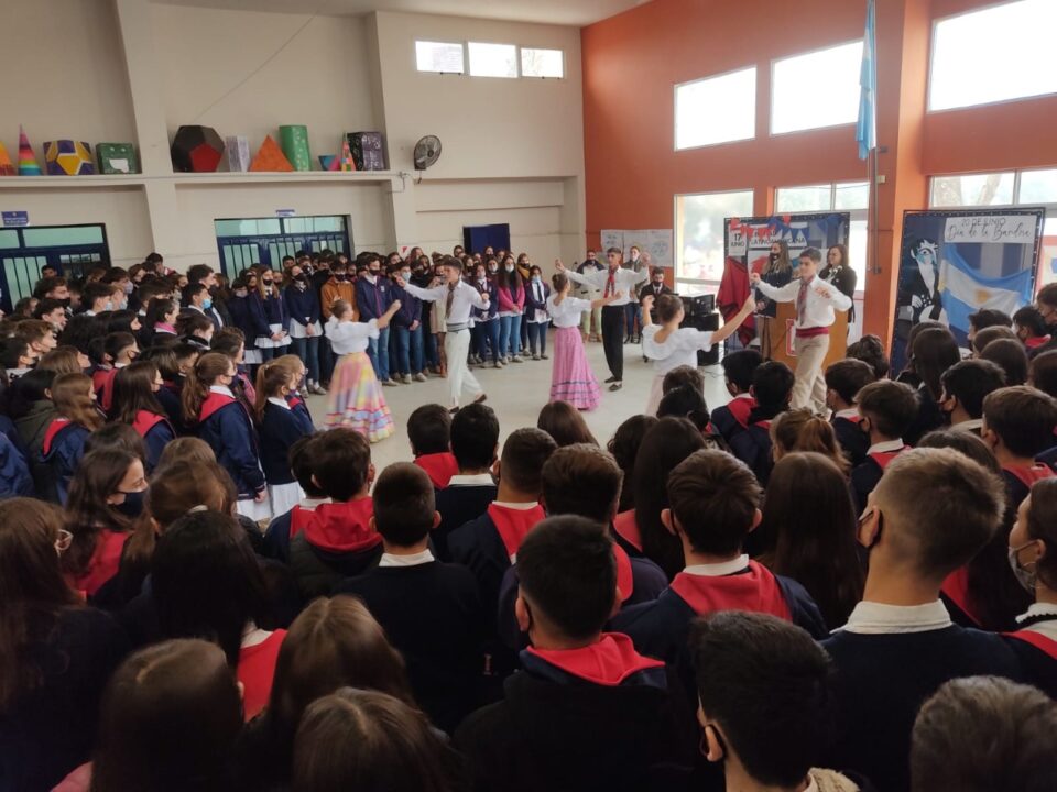 Luego, se cantó “Sube Bandera del amor” de la reconocida Mercedes Sosa, máximo exponente de nuestra música folklórica argentina. Como cierre, los alumnos de 6° Año: Abril y Sol Carrera Tosco, Bruno Giordana, Tomás Nazario, Tomás Samiz y Delfina Testa, bailaron una Chacarera dedicada al heroico Belgrano, a cargo de la Profesora Yanina Rivarola.