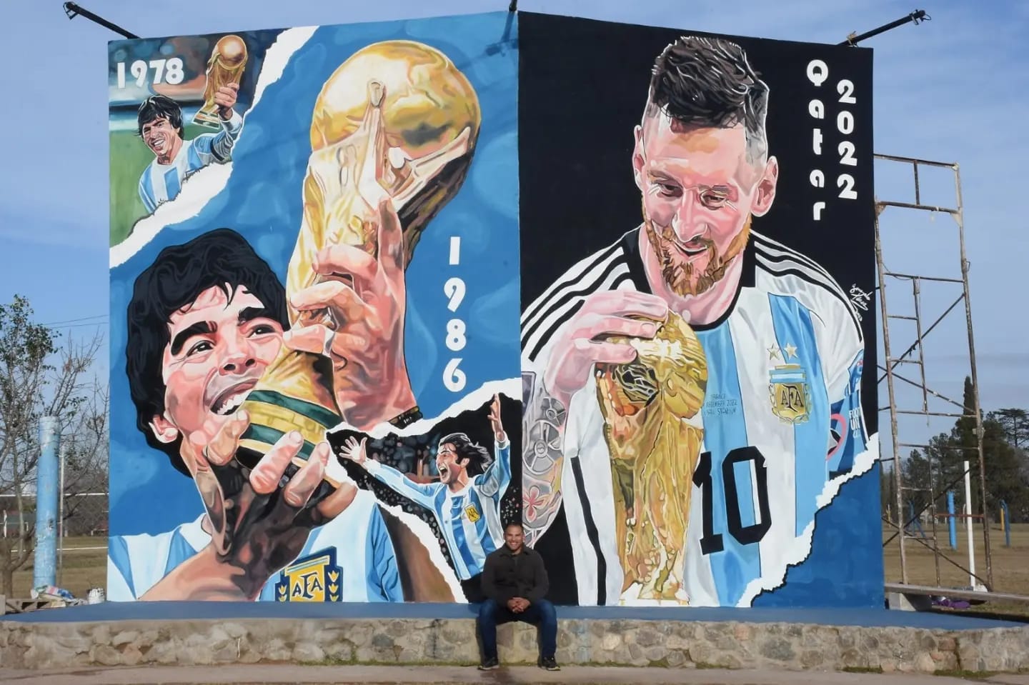 El talentoso artista plástico e imitador Gonzalo Pérez realizó un imponente mural de Campeones de los Mundiales de Fútbol de 1978, 1986 y 2022, en una transitada esquina de su pueblo natal, Adelia María.