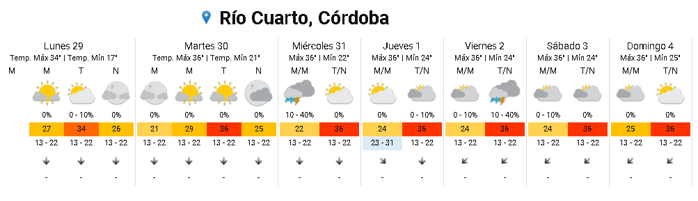 Río Cuarto y gran parte de la provincia tendrán temperaturas máximas que superarán los 34 grados e irá en alza durante el resto de la semana. Para la ciudad, las máximas llegarán a los 36 grados con mínimas que no bajarían de los 22 grados. De acuerdo a la proyección del SMN, no hay precipitaciones a la vista hasta el miércoles.
