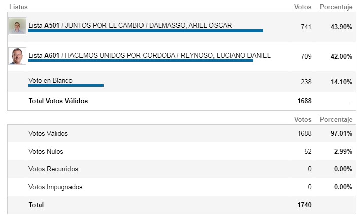 Ariel Dalmasso, candidato a intendente de la oposición obtuvo el 43.90% de los votos (741), contra el 42% (709 votos) que sumó Luciano Reynoso del oficialismo. De esta manera, con 32 votos de diferencia, la conducción del municipio de Carnerillo cambiará de fuerza política.
