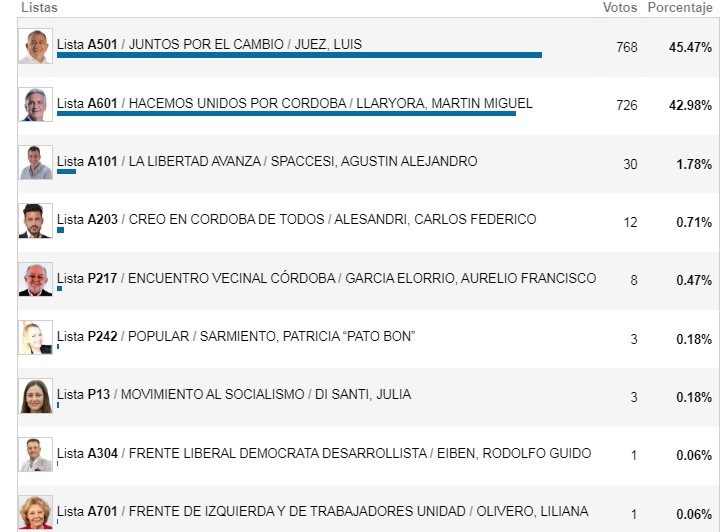 En las elecciones para gobernador, Juntos por el Cambio también se impuso por muy poco en Carnerillo. Luis Juez sumó 45.47% contra el 42,98% de Martín Llaryora.