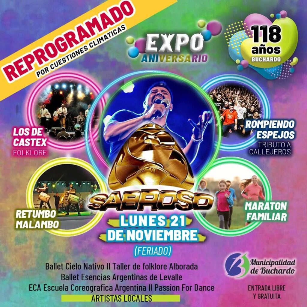 La intendenta destacó que tiene confirmados unos 90 puestos de artesanos, “lo cual para Buchardo es impresionante. Habrá una gran cantidad de emprendedores y artesanos. Finalmente destacó que la esta Expo Aniversario finalizará con un show a puro cuarteto con la presentación de Sabroso.