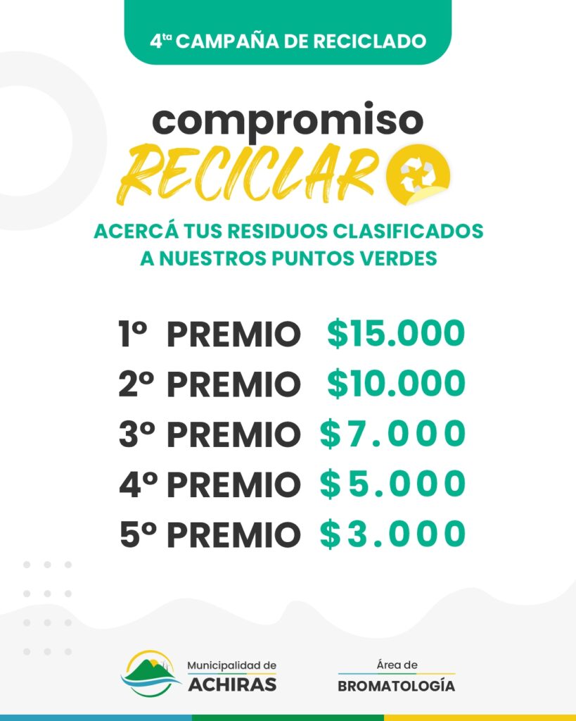 Desde el Área de Bromatología de la Municipalidad de Achiras, se realizó un concurso con el fin de promover el reciclaje en las y los vecinos. El premio consiste en dinero en efectivo que se sorteará en el mes de septiembre
