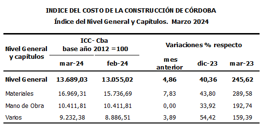 Durante el mes de marzo de 2024, el Índice del Costo de la Construcción de Córdoba (ICC- Cba) registró una variación mensual del 4,86% en su Nivel General y del 245,62% en relación a marzo de 2023.