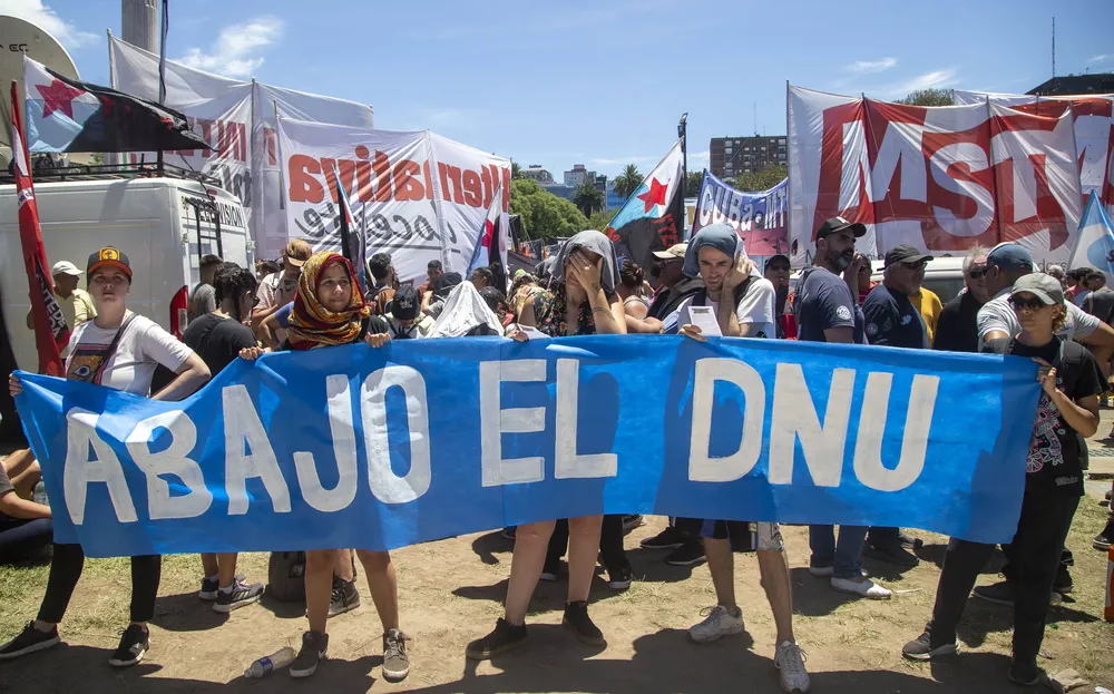 Ante la masiva manifestación que colmó la zona de Tribunales, el documento leído por una locutora señala: “Vinimos hoy a pedirle a la Justicia que cumpla con la función de contralor el Poder Ejecutivo y declare la inconstitucionalidad del DNU”.