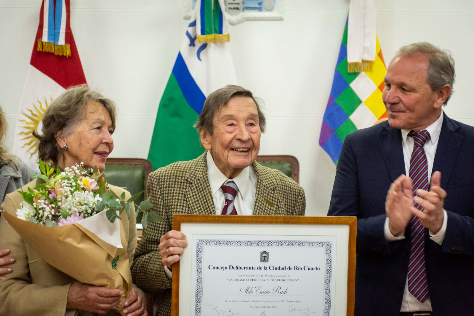 En una sesión especial presidida por el intendente Guillermo de Rivas y la presidenta del Concejo Deliberante, Ana Laura Medina, el ingeniero agrónomo Aldo Ennio Rudi fue distinguido como Ciudadano Ilustre de Río Cuarto. El reconocimiento contó con la presencia de su esposa, familiares, amigos e instituciones de la ciudad.