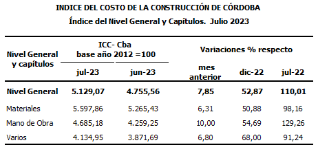 Durante julio, el Índice del Costo de la Construcción de Córdoba (ICC- Cba) registró una variación mensual del 7,85% en su Nivel General y del 110,01% en relación a julio de 2022.