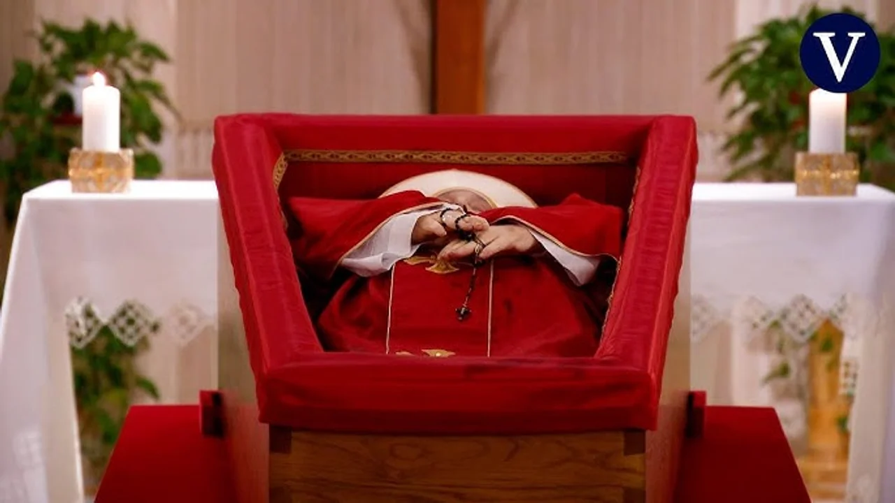 El Vaticano hizo públicas este martes las primeras imágenes del féretro del papa Francisco. El ataúd del Sumo Pontífice está dispuesto en la Capilla de Santa Marta. Se trata de un simple ataúd de madera abierto sin el catafalco, en el que el Papa descansa vestido con la mitra, la sotana blanca, la casulla roja y el palio blanco. En sus manos sostiene el rosario.
