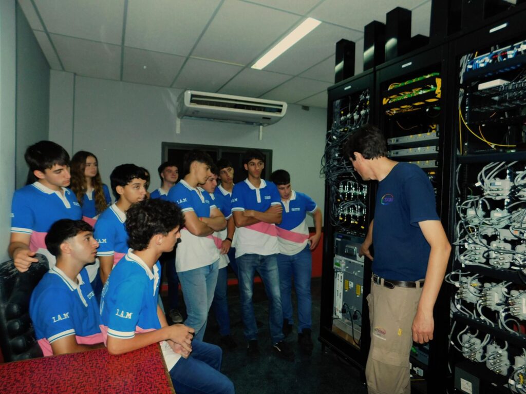 Luego de compartir un desayuno en las oficinas centrales, el responsable del Área Técnica, Ing. en Telecomunicaciones Diego Rogna, guió a los estudiantes por las instalaciones tecnológicas de CTAM. Durante esta instancia, se destacó la evolución tecnológica de los servicios de Tecnologías de la Información y la Comunicación (TIC) que la cooperativa brinda a los vecinos de Adelia María.
