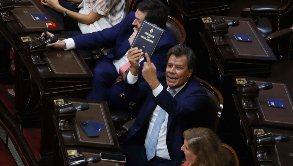 El diputado radical agitó la carta magna durante el discurso del jefe de Estado y le reprochó las nominaciones por decreto en la Corte Suprema. Javier Milei lo tildó de «kirchnerista». Facundo Manes denunció amenazas de Santiago Caputo y una agresión de uno de sus allegados.