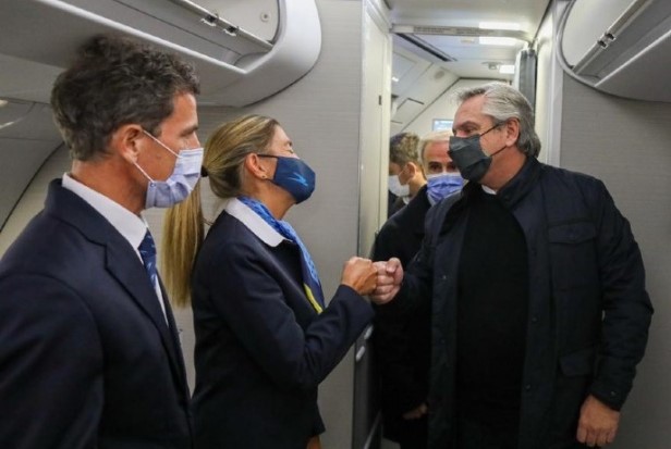 La comitiva oficial, encabezada por el mandatario y el canciller Santiago Cafiero, partió pasadas las 22.18 desde el aeropuerto de Ezeiza en el vuelo AR 1090 de Aerolíneas Argentinas.