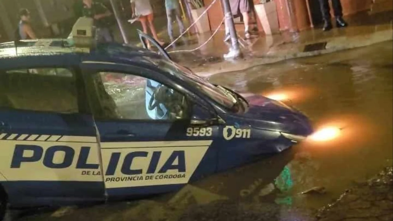 Las imágenes impactaron cuando un móvil policial cayó en una arteria de la periferia céntrica. Con la calle Paso de los Andes con agua de lado a lado, el vehículo intentó pasar calle Caseros, cuando literalmente quedó hundido. El hecho tuvo lugar cerca de la medianoche.