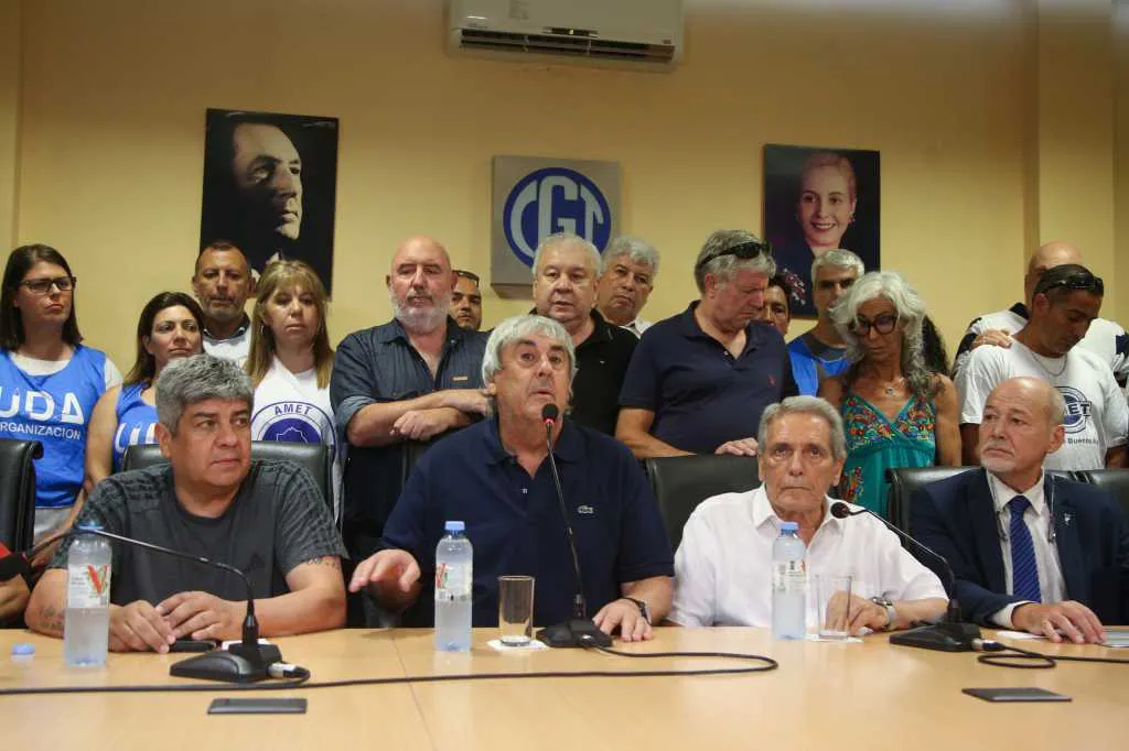 En respaldo a la medida de fuerza lanzada por los sindicatos de las maestras y maestros, en la rueda de prensa estuvieron presentes los cosecretarios de la CGT, Pablo Moyano y Carlos Acuña.