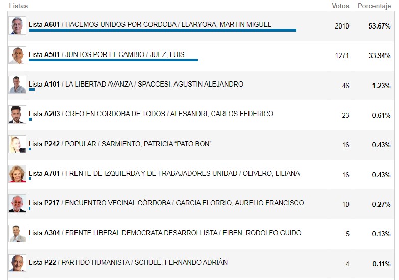 También fue contundente en la localidad el triunfo de Martín Llaryora para la gobernación más del 53% de los votos, contra el casi 34% de Luis Juez.