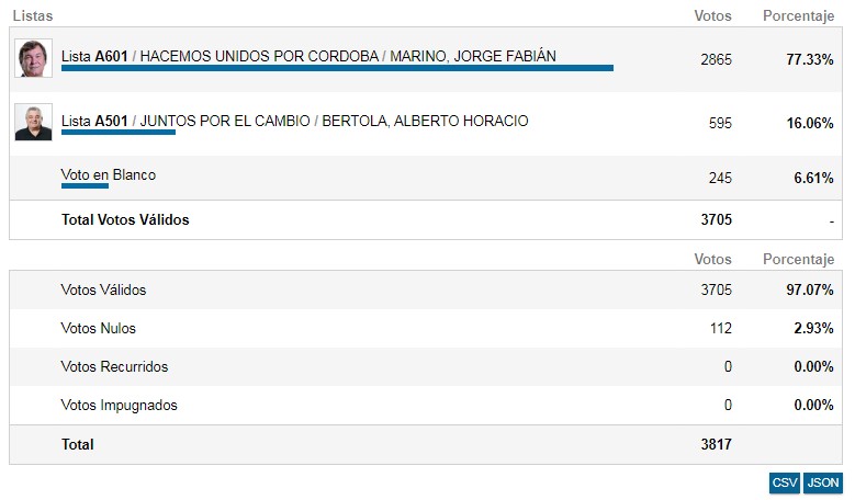Jorge Marino, candidato de Hacemos Unidos por Córdoba obtuvo más del 77% de los votos contra el 16% de Alberto Bertola, candidato de Juntos por el Cambio.