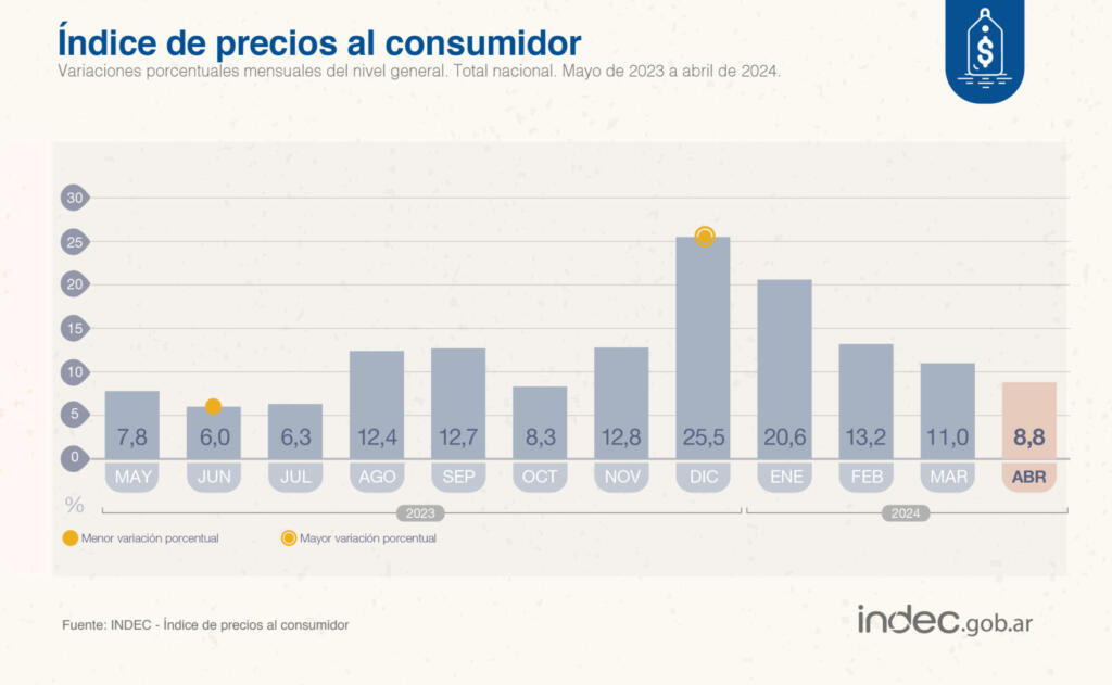 En medio de la fuerte recesión económica, el índice de inflación finalmente descendió a un dígito. Según el INDEC, en el cuarto mes del año fue de 8,8%.