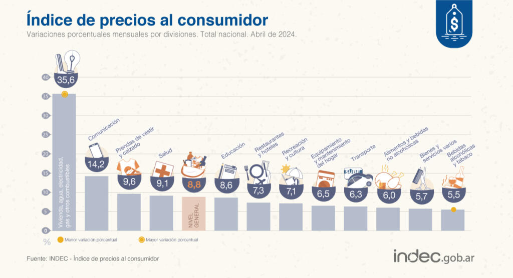 La división de mayor aumento en el mes fue Vivienda, agua, electricidad, gas y otros combustibles (35,6%) por los incrementos en las tarifas de gas, agua y electricidad. Le siguieron Comunicación (14,2%), por las subas en servicios de telefonía e internet, y Prendas de vestir y calzado (9,6%) por cambios de temporada.