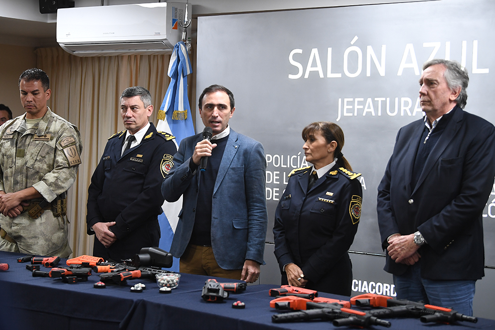 El ministro de Gobierno y Seguridad, Julián López junto al secretario de Seguridad, Claudio Stampalija y a la Jefa de la Policía de Córdoba, Liliana Zárate Belletti, presentaron la adquisición de 1000 armas no letales que se suman al equipamiento de la Policía de Córdoba.