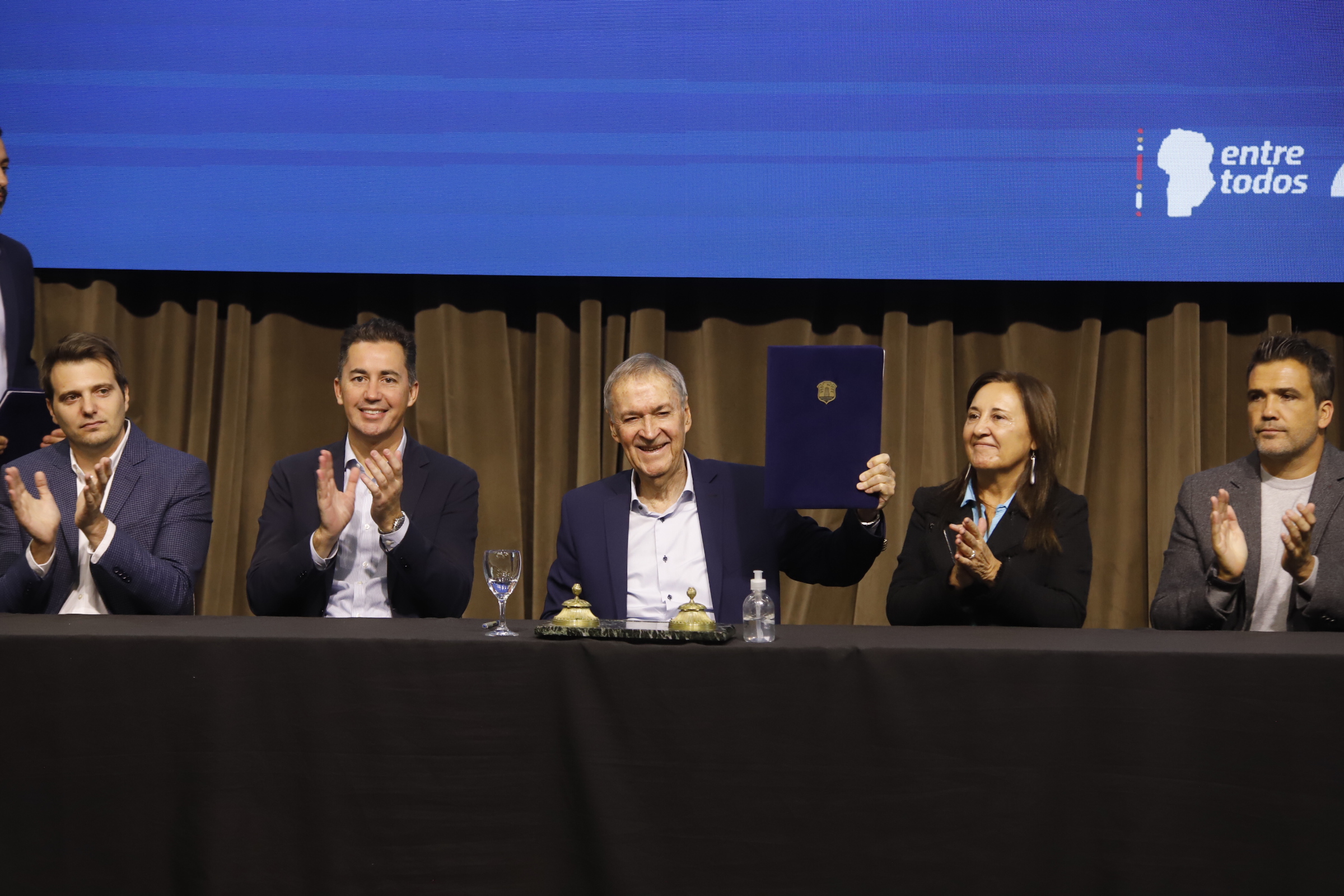 La firma se realizó con el intendente de Sebastián Elcano, Lucas Lerda; de San Marcos Sierras, César Briguera; de San José de las Salinas, Marcelo Ruiz; la jefa comunal de La Rinconada, Aurora Peralta; su par de La Rancherita, Alejandro Sosa y el secretario de Gobierno de Valle Hermoso, Edgardo Quaino.