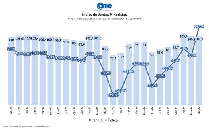 Así surge del Índice de Ventas Minoristas Pymes de la Confederación Argentina de la en Mediana Empresa (CAME), elaborado en base a un relevamiento mensual entre 1.262 comercios minoristas del país, realizado entre el 2 y el 3 de enero de 2025.