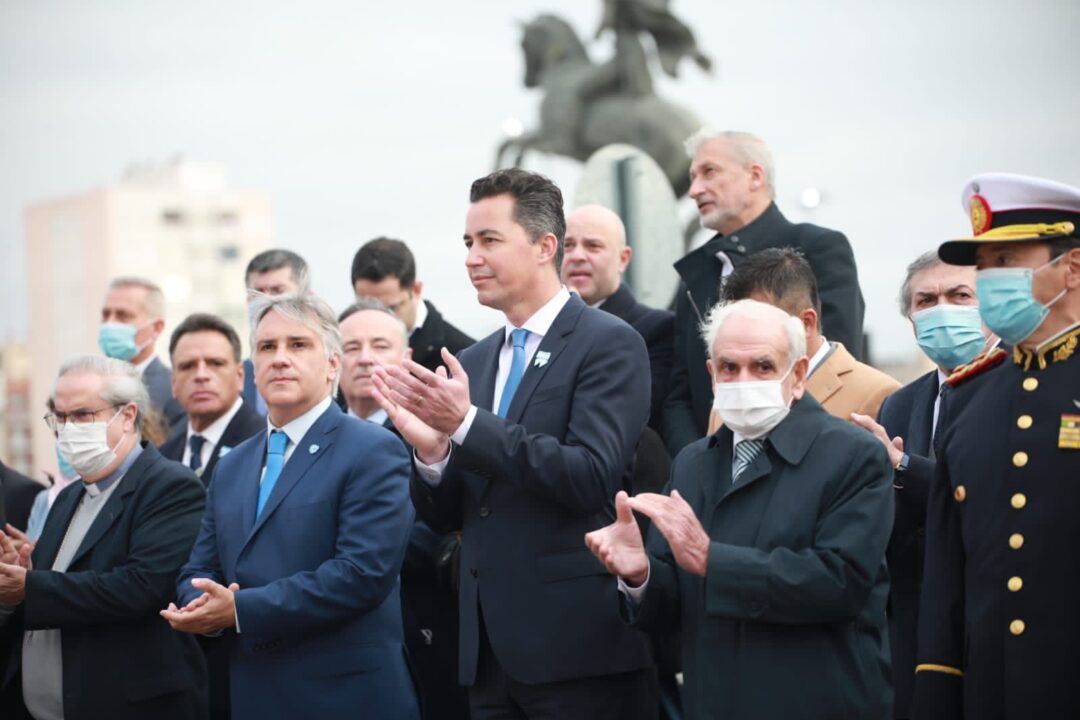 Acompañado por el intendente de la ciudad, Martín Llaryora, atravesó el cordón de honor integrado por miembros de la Fuerzas Armadas y de Seguridad que lucieron sus uniformes históricos, hasta ubicarse frente a los mástiles.