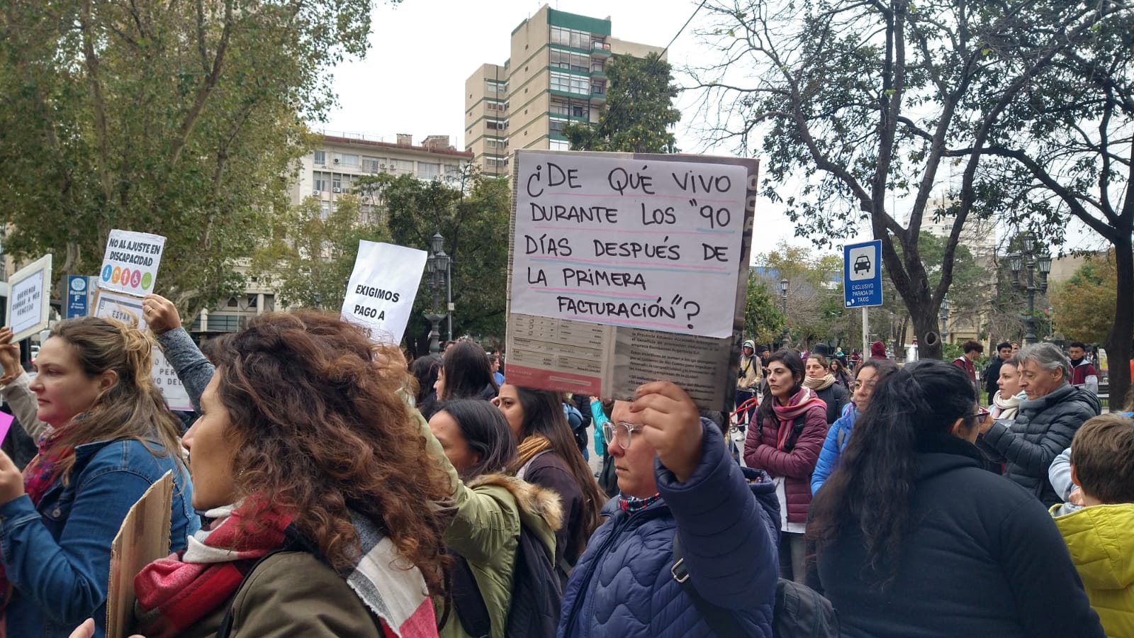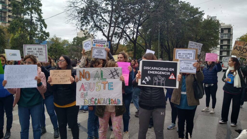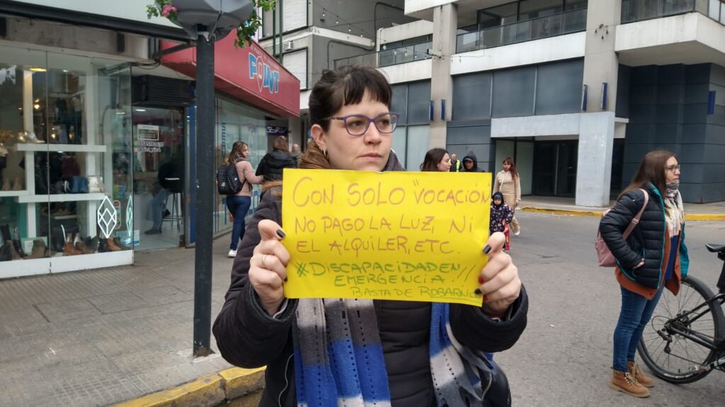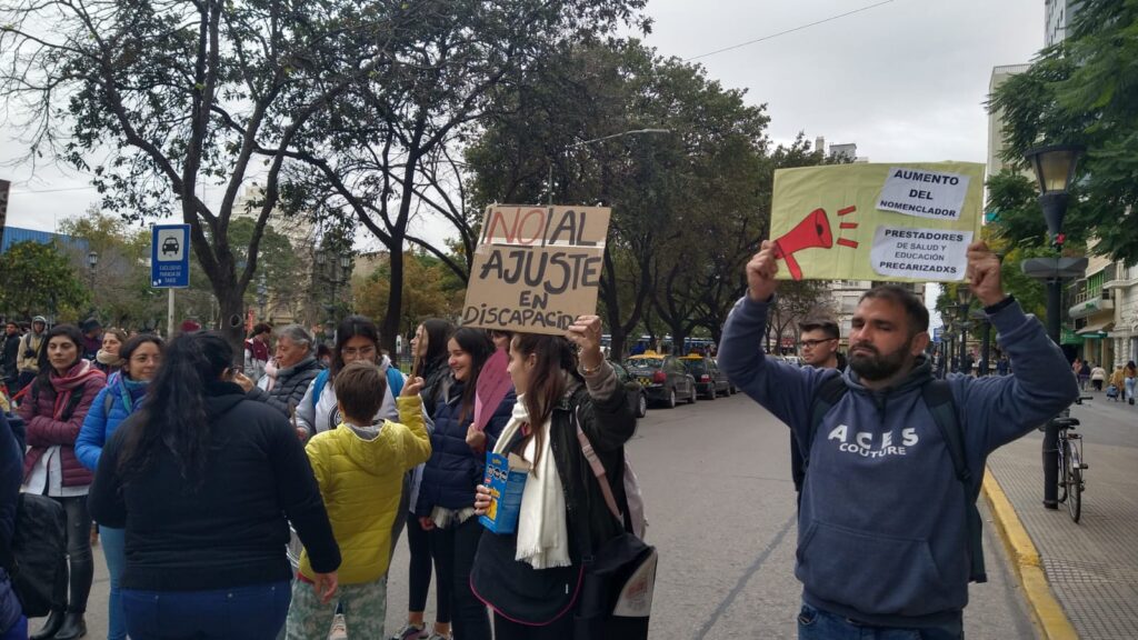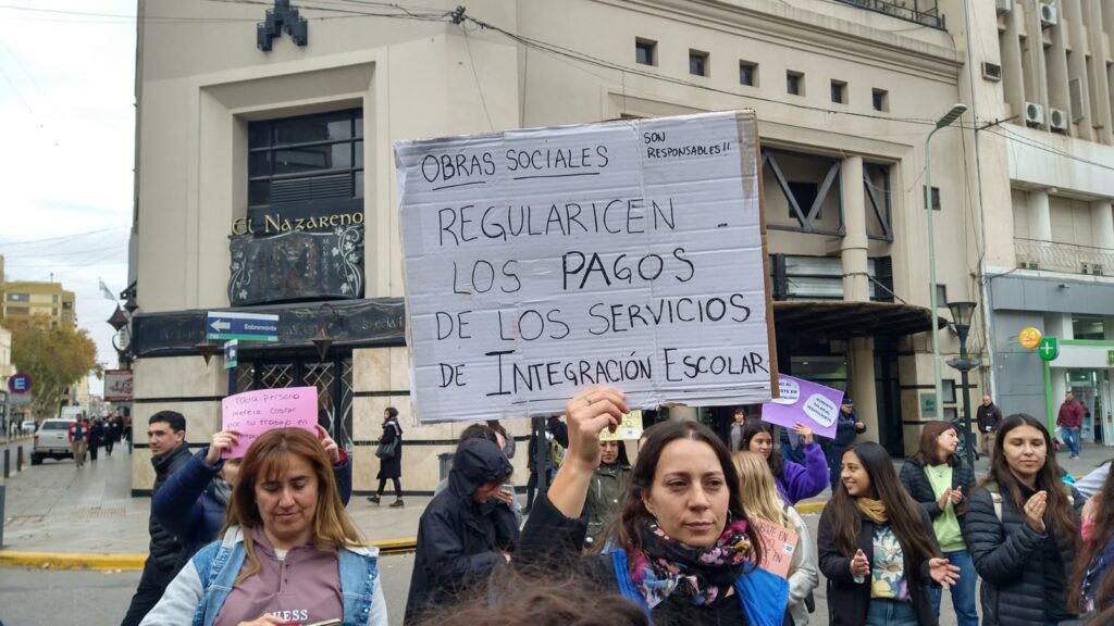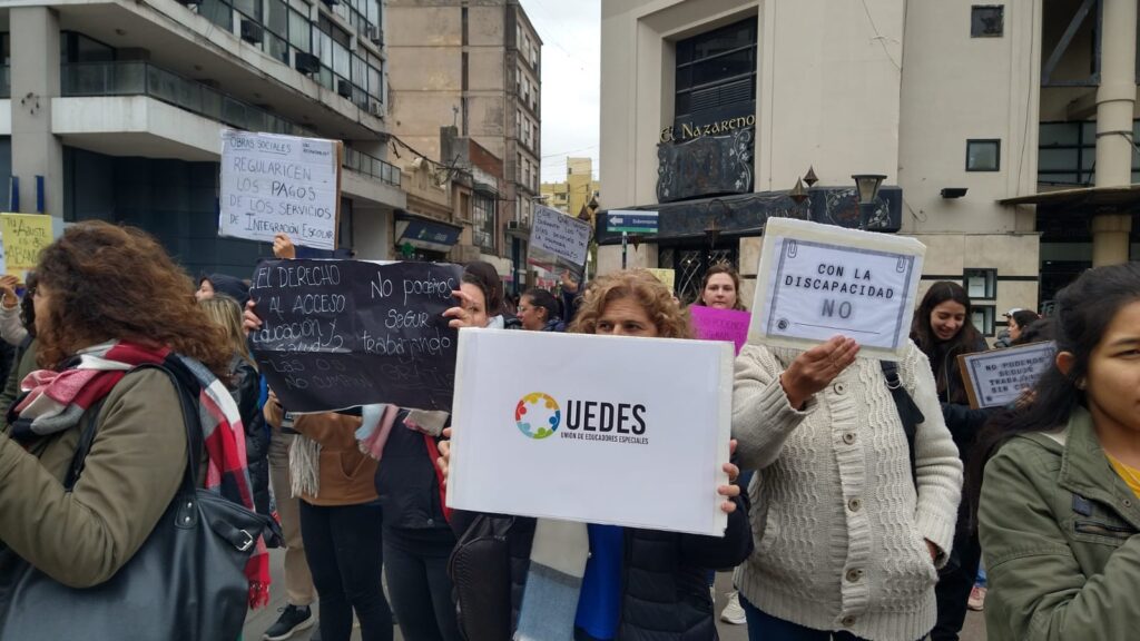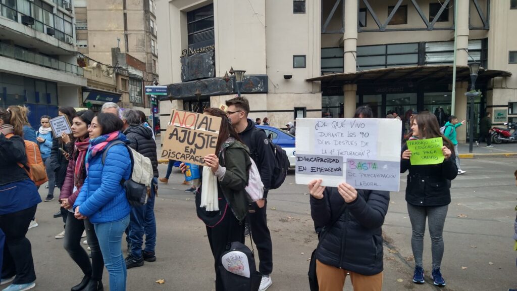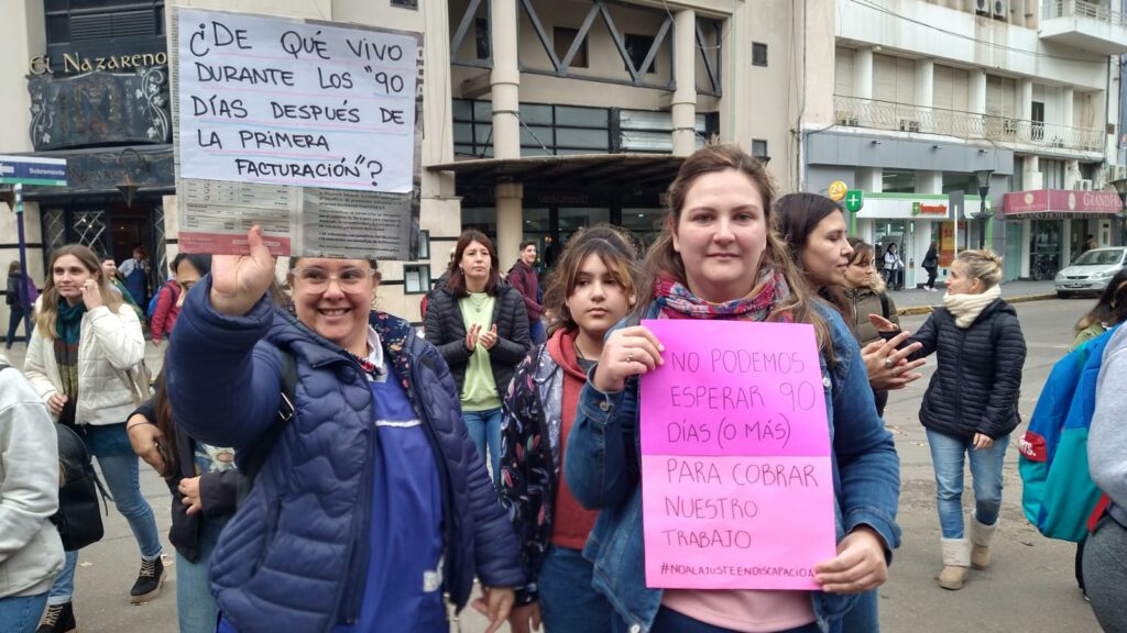 Profesionales que brindan educación y atención en salud a personas con discapacidad se manifestaron esta mañana en Río Cuarto en reclamo por la demora en el pago de sus prestaciones.