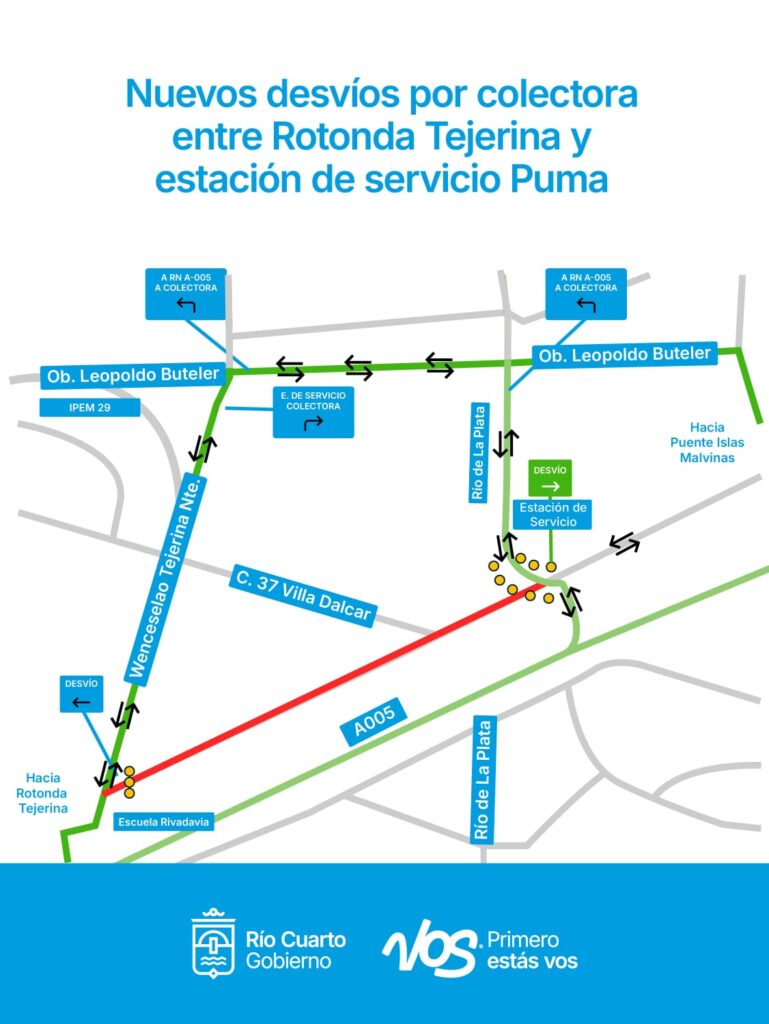 La Dirección General de Tránsito de Río Cuarto informó que, a partir del jueves 13 de noviembre, se realizarán cortes totales en la colectora de la Circunvalación entre la Rotonda Tejerina y la estación de servicio Puma Energy, debido al avance de las obras viales que se desarrollan en el sector.