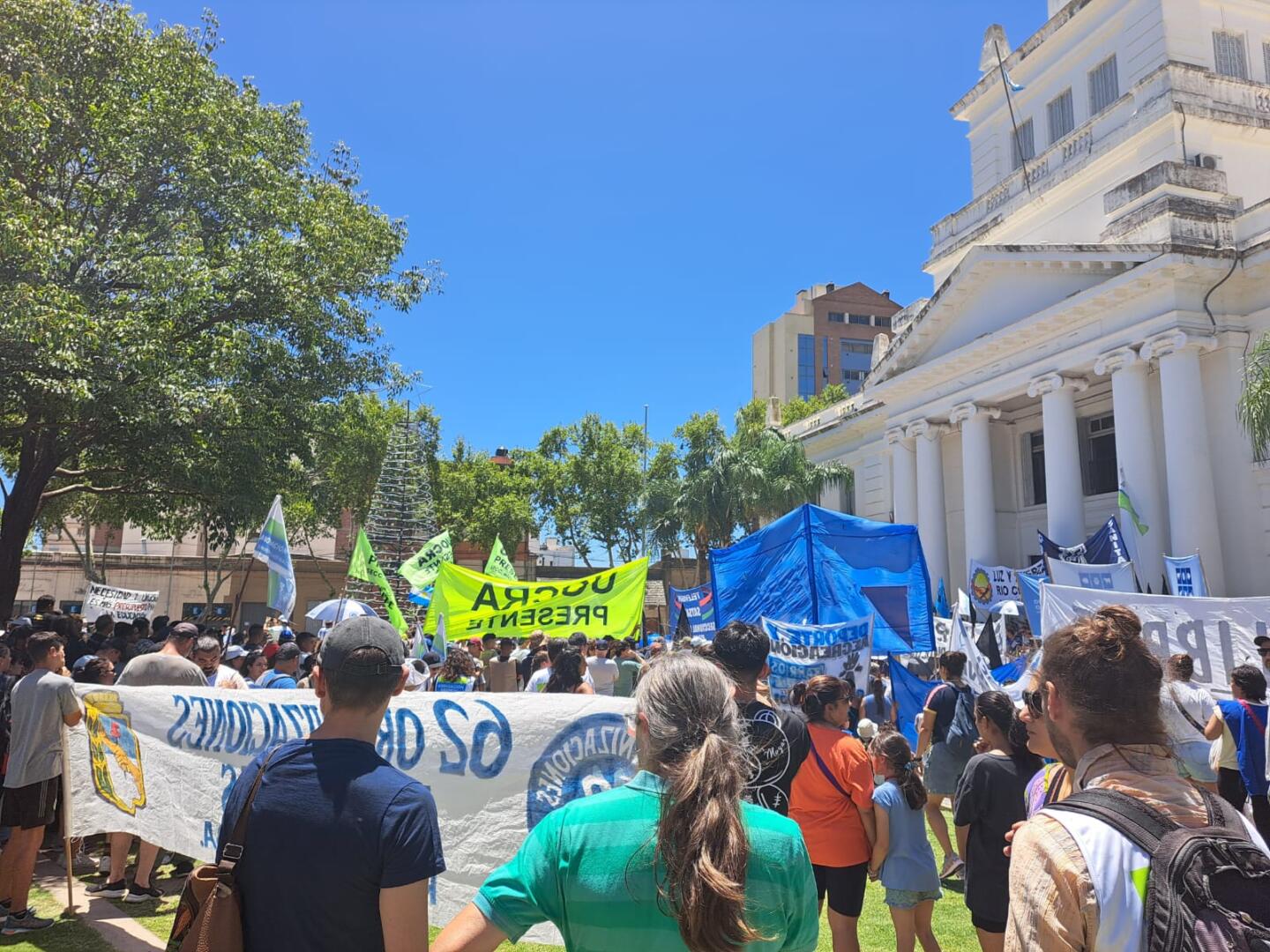 A partir de las 11:30 comenzó la concentración en la rotonda San Martín, bajo la consigna “La Patria no se vende”. Desde allí, gremios, ciudadanos y diferentes organizaciones sociales, estudiantiles, barriales, de derechos humanos, etc. marcharon hacia la plaza central de la ciudad y finalizaron con la lectura de un documento frente al Palacio Municipal.
