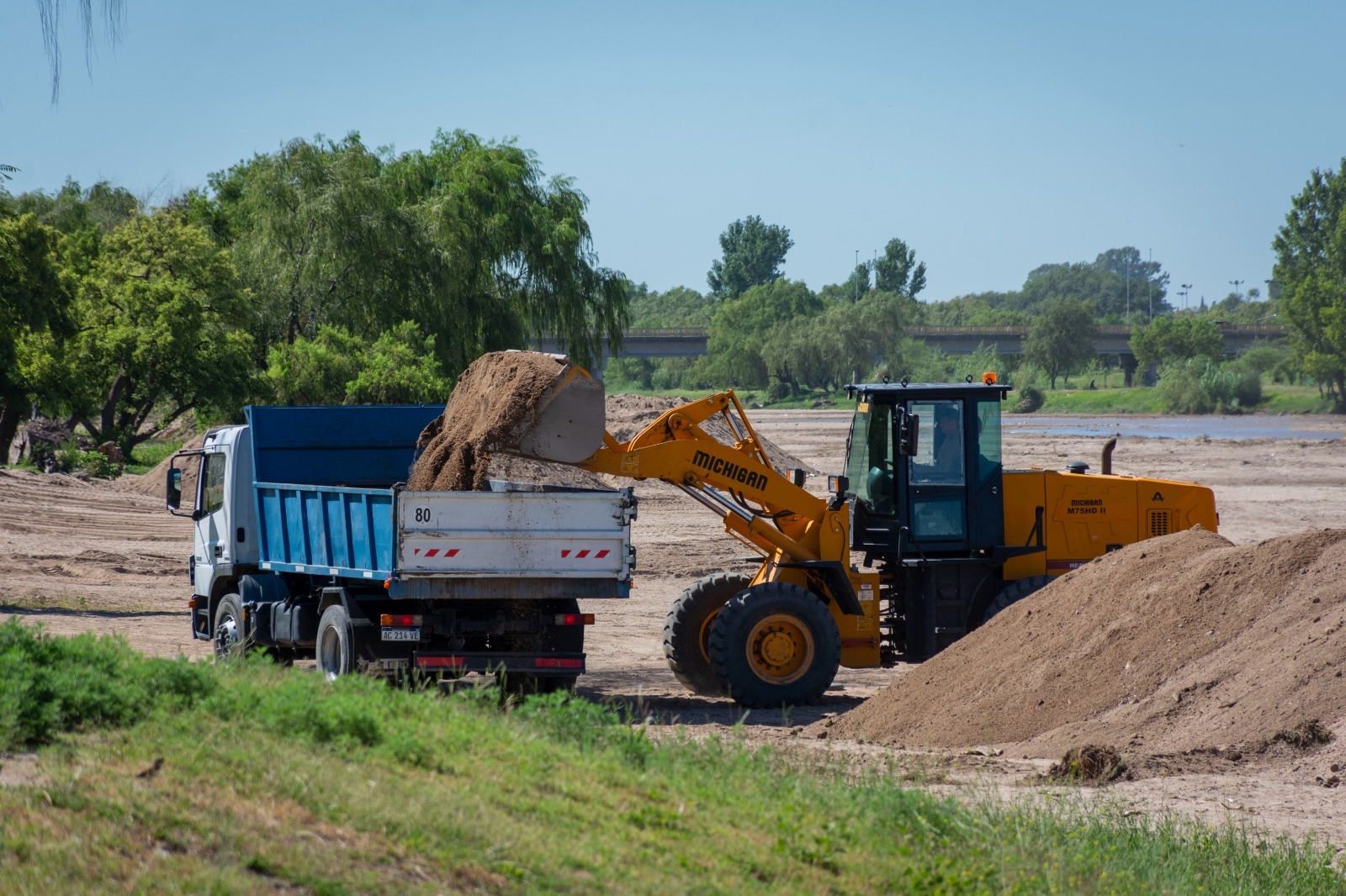 Durante enero se desarrolla una importante tarea que tiene múltiples beneficios para la ciudad. Se trata de la extracción de áridos para mejorar el cauce del río y proteger la margen sur de las erosiones. Pero, a la vez, la acción también sirve para reparar las calles de tierra, debido a que la arena que se saca es distribuida por las arterias no pavimentadas para hacer que la circulación vial sea más fluida.