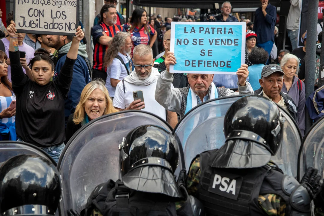 Afuera, la movilización de jubilados en reclamo por la prórroga de la moratoria previsional y la restitución del 100% de los medicamentos del PAMI terminó con una fuerte represión de la Policía Federal y la Policía de la Ciudad. Hubo heridos, detenidos y escenas de extrema violencia, como la agresión a una jubilada por parte de un efectivo y el impacto de un cartucho de gas lacrimógeno que provocó una fractura de cráneo al reportero gráfico Pablo Grillo.