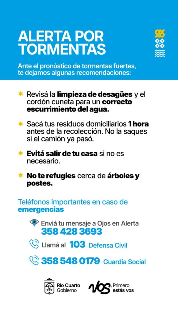 Desde la Secretaría de Gestión de Riesgo se recomendó a la población liberar desagües, asegurar objetos que puedan volarse y evitar realizar actividades al aire libre o circular durante el paso de las tormentas.