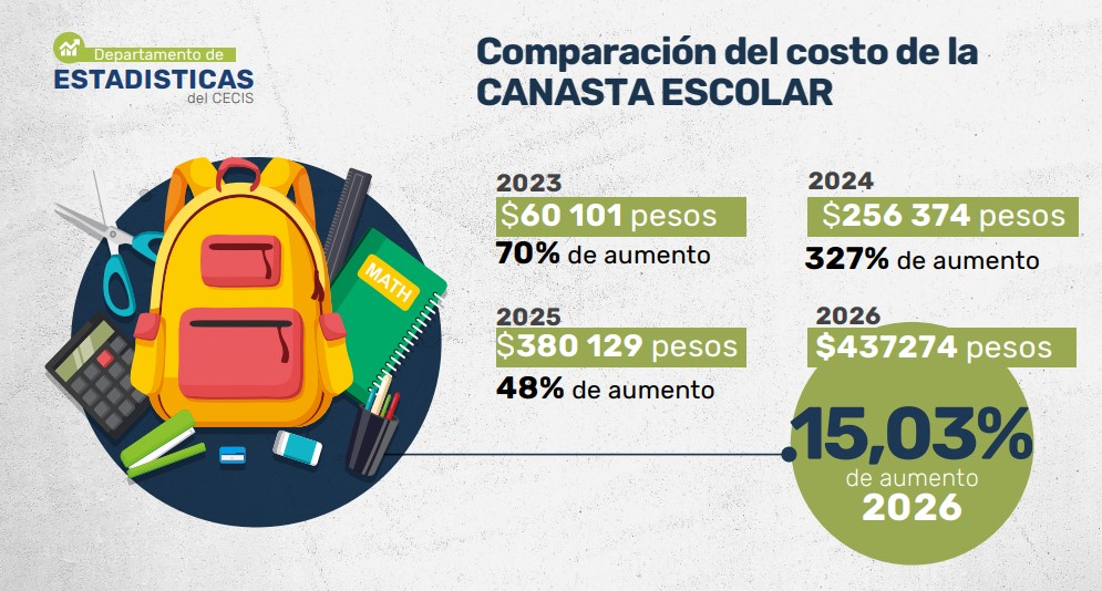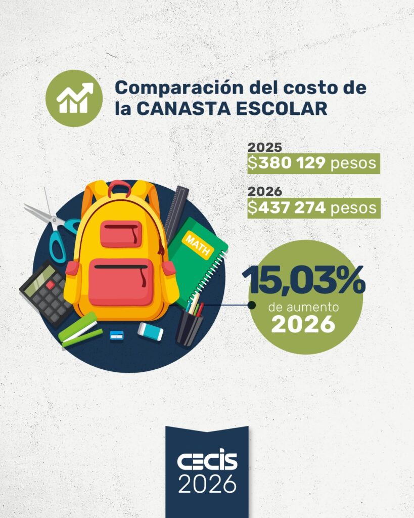 El costo de la canasta escolar para el ciclo lectivo 2026 se ubica en $437.273,92, lo que representa un incremento del 15,03% respecto a 2025, según el último relevamiento del Centro Empresario, Comercial, Industrial y de Servicios de Río Cuarto (CECIS).