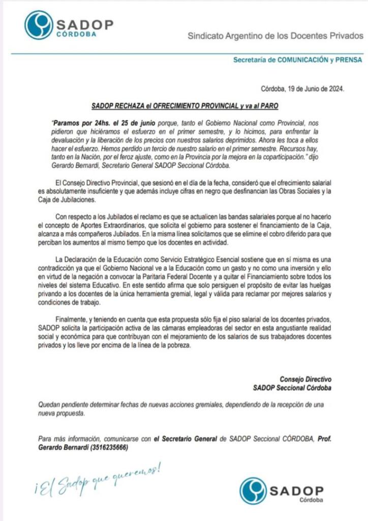 “Paramos por 24 horas el 25 de junio porque, tanto el Gobierno Nacional como Provincial, nos pidieron que hiciéramos el esfuerzo en el primer semestre, y lo hicimos, para enfrentar la devaluación y la liberación de los precios con nuestros salarios deprimidos. Ahora les toca a ellos hacer el esfuerzo. Hemos perdido un tercio de nuestro salario en el primer semestre. Recursos hay, tanto en la Nación, por el feroz ajuste, como en la Provincia por la mejora en la coparticipación”, dijo Gerardo Bernardi, secretario General SADOP Seccional Córdoba.