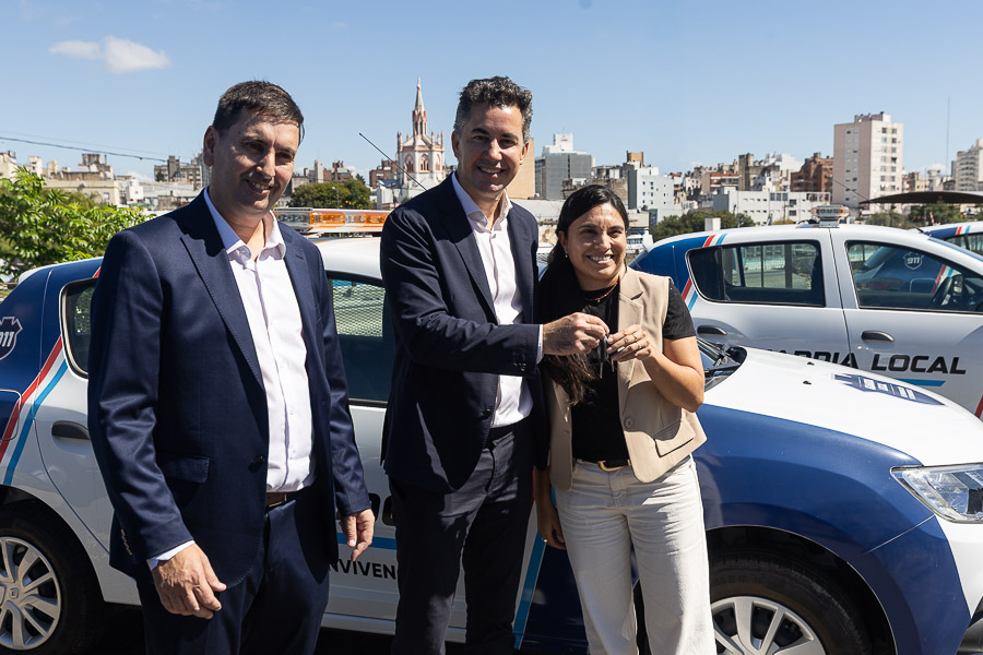 El acto, encabezado por el ministro de Gobierno Manuel Calvo en el Centro Cívico, incluyó la entrega de 15 vehículos 0 km —entre camionetas Nissan Frontier y automóviles Renault Sandero—, además de chalecos balísticos y armamento de letalidad reducida destinado a tareas de patrullaje y prevención.