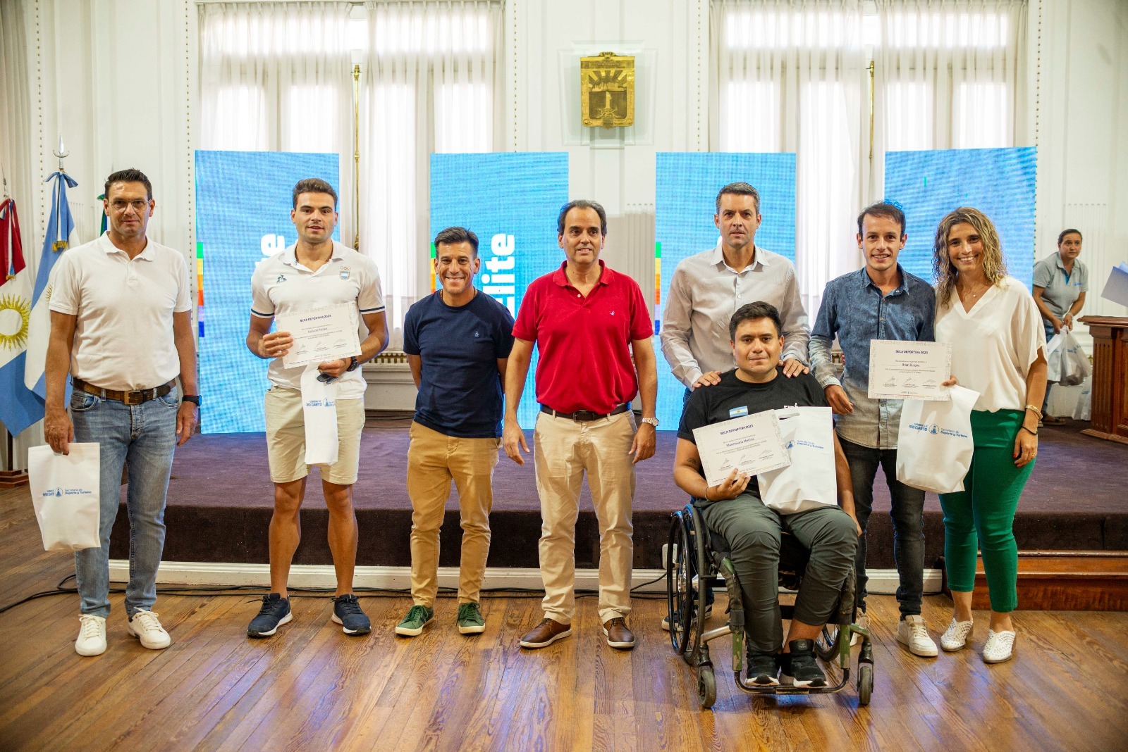 El Intendente Juan Manuel Llamosas encabezó anoche la entrega de certificaciones a los beneficiarios y beneficiarias del Programa Becas Deportivas que impulsa la Secretaría de Deporte y Turismo del Gobierno de Río Cuarto. El acto se desarrolló en el Salón Blanco del Palacio Municipal.