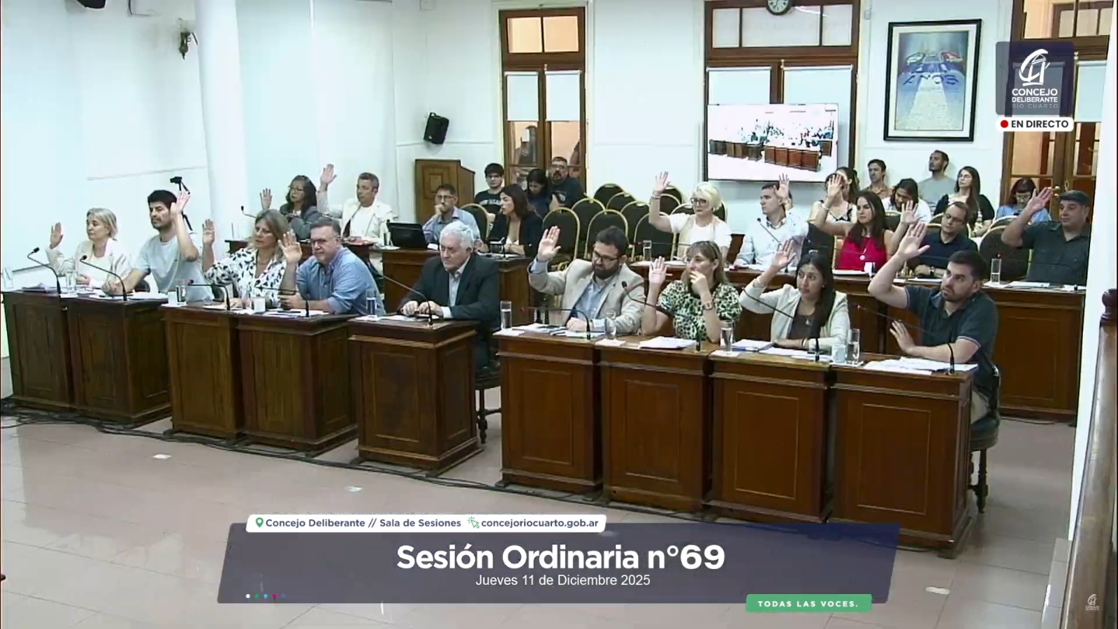 El Concejo Deliberante de Río Cuarto vivió este jueves una de las últimas sesiones fuertes del año legislativo, marcada por definiciones clave para la agenda fiscal y administrativa del 2026. Tal como se preveía tras el debate en comisiones, el Presupuesto Municipal, la Tarifaria Anual y las modificaciones al Código Tributario fueron aprobados únicamente con los votos del oficialismo, que logró sostener la mayoría necesaria pero sin acompañamiento opositor.