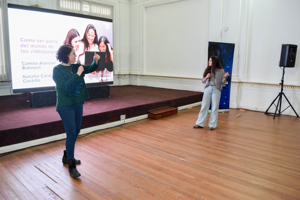 Una de las disertantes de la jornada fue Camila Alarcón Bidinost, programadora de videojuegos, explicó la idea del taller: “Buscamos mostrar que los videojuegos están hechos por personas y hay muchas mujeres trabajando en esta industria, queremos contagiar entusiasmo de esto que hacemos. Disfruto este trabajo, me abrió muchas puertas, es una industria donde hay compañerismo, el ambiente de trabajo es muy bueno y hay vacantes para ocupar. Para esto hay que estudiar bastante pero no es imposible, hay lugar para todos y no hay edades para participar”.