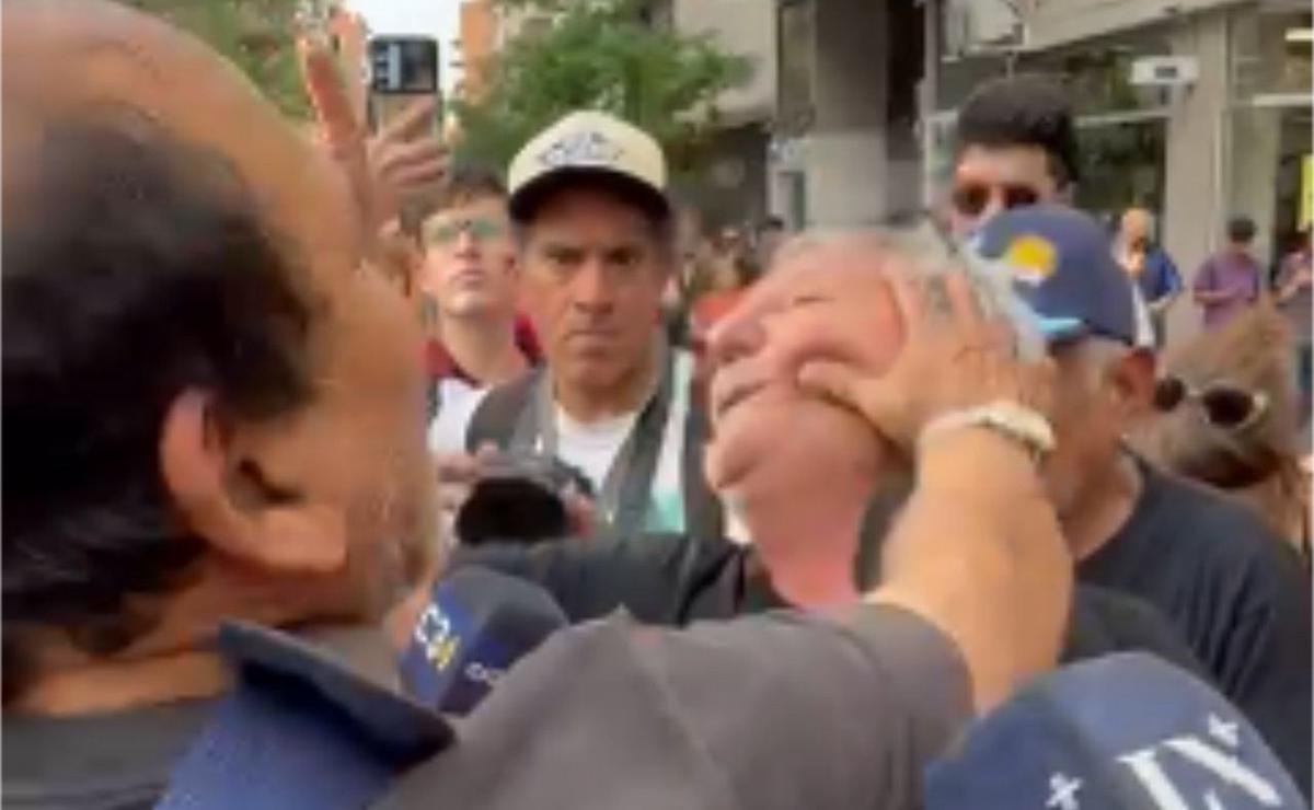 Mientras dialogaba con los periodistas, comenzó a cantar la marcha peronista. En ese momento, un militante libertario se aproximó, lo insultó y le propinó un golpe en la cara. Pese a la agresión, la víctima respondió con calma: “Pégame todo lo que vos quieras”, y se retiró del lugar caminando de espaldas, mientras seguía entonando el canto partidario.