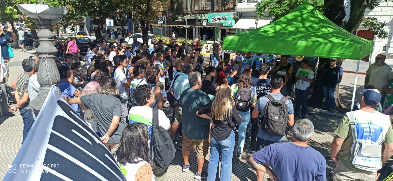 En el marco del paro de 48 horas convocado por los gremios universitarios, trabajadores de la Universidad Nacional de Río Cuarto (UNRC) llevaron adelante una volanteada en Plaza Roca para visibilizar su reclamo por mejoras salariales y mayor presupuesto para las universidades públicas. La medida fue impulsada de manera conjunta por la Asociación Gremial Docente (AGD) y la Asociación de Trabajadores de la UNRC (ATURC), con un alto nivel de adhesión.