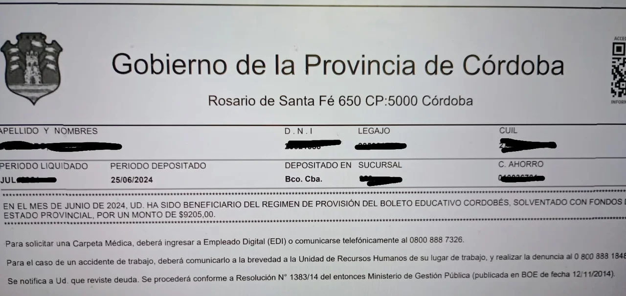«En el mes de junio de 2024, ud. ha sido beneficiario del régimen de provisión del Boleto Educativo Cordobés, solventado con fondos del Estado provincial, por un monto de $9.205,00″, se lee en un recibo de sueldo compartido vía redes sociales