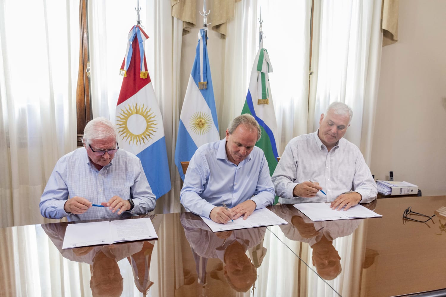 El Intendente Guillermo De Rivas y el Director del Ente Municipal de Obras Sanitarias (EMOS), Juan José Oses, firmaron un acuerdo con el empresario representante del Ente Promotor del Colector Cloacal Oeste, Julio Boehler, con el objetivo de iniciar la construcción de dicha obra.