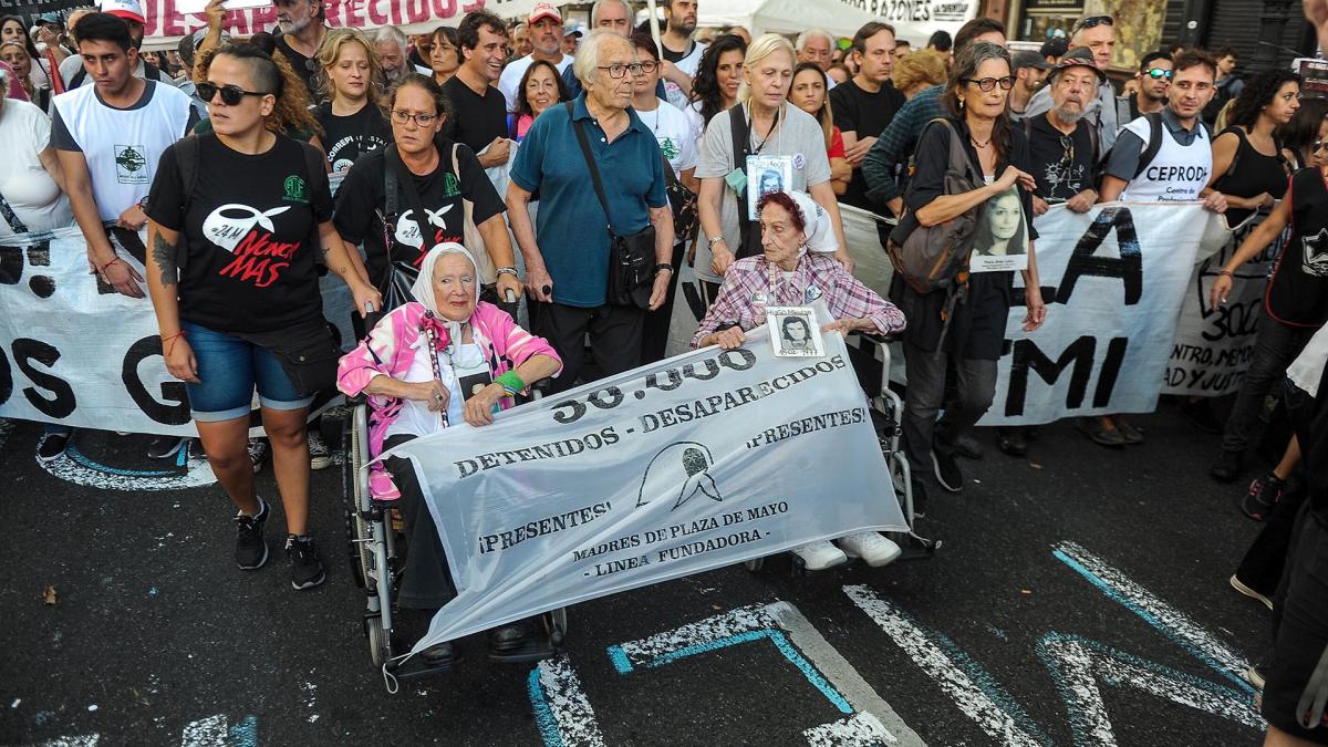 «Vamos a seguir cuidando esta democracia en la Argentina y en toda la Patria Grande siempre. Cuando lo hacemos estamos honrando la memoria de quienes lucharon por una patria justa libre y soberana», dijo la presidenta de la Asociación Abuelas de Plaza de Mayo, Estela de Carlotto, al leer el final del comunicado desde arriba del escenario en medio de la histórica plaza.