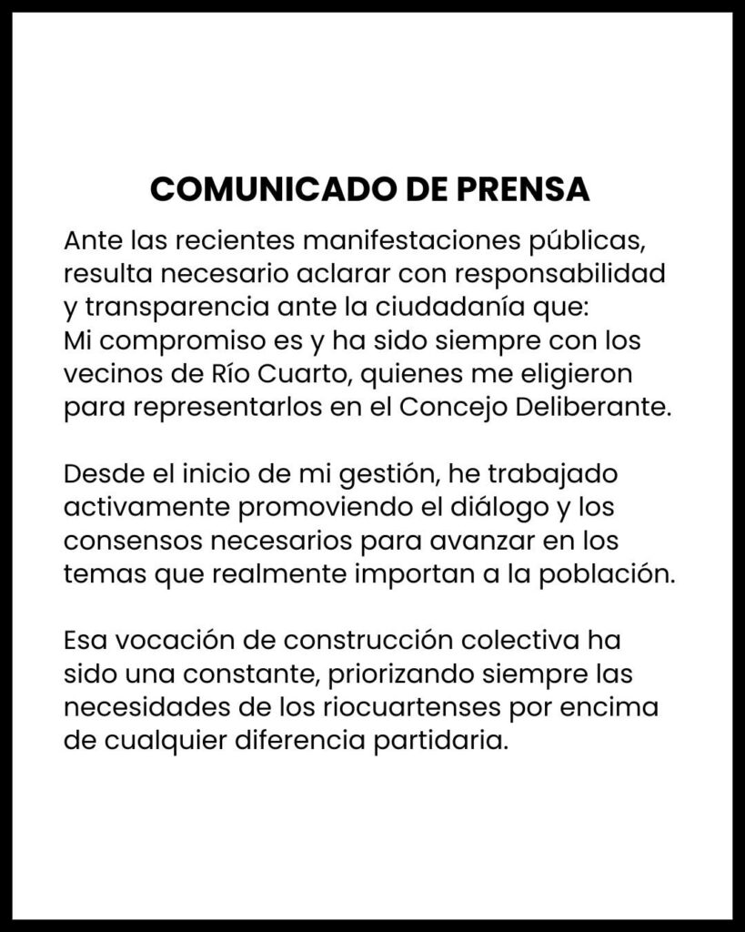 A través de un descargo, la edil sostuvo que su compromiso “es y ha sido siempre con los vecinos de Río Cuarto”, quienes la eligieron para ocupar una banca, y remarcó que su accionar legislativo se ha basado en el diálogo y la búsqueda de consensos.