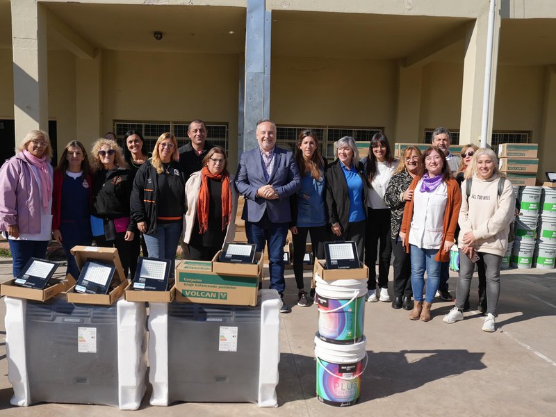 Allí, se entregaron 300 litros de pintura impermeabilizante para muros exteriores destinados al IPEM 49, que permitirán el pintado completo de la manzana del edificio, con mano de obra a cargo del Fondo para la Descentralización del Mantenimiento de Edificios Escolares Provinciales (FODEMEEP).